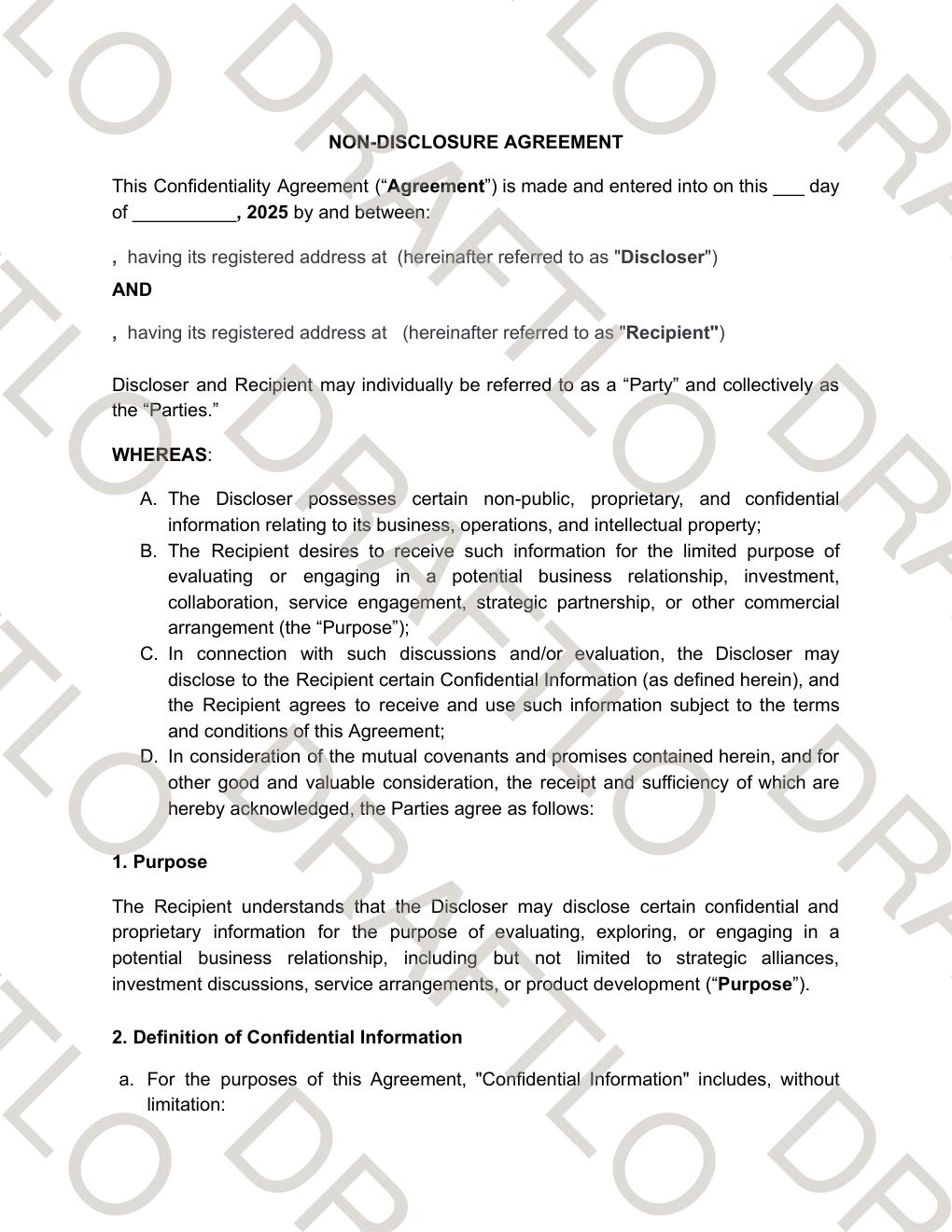 This document is a Non-Disclosure Agreement (NDA) template designed for protecting confidential information in business discussions and potential partnerships.