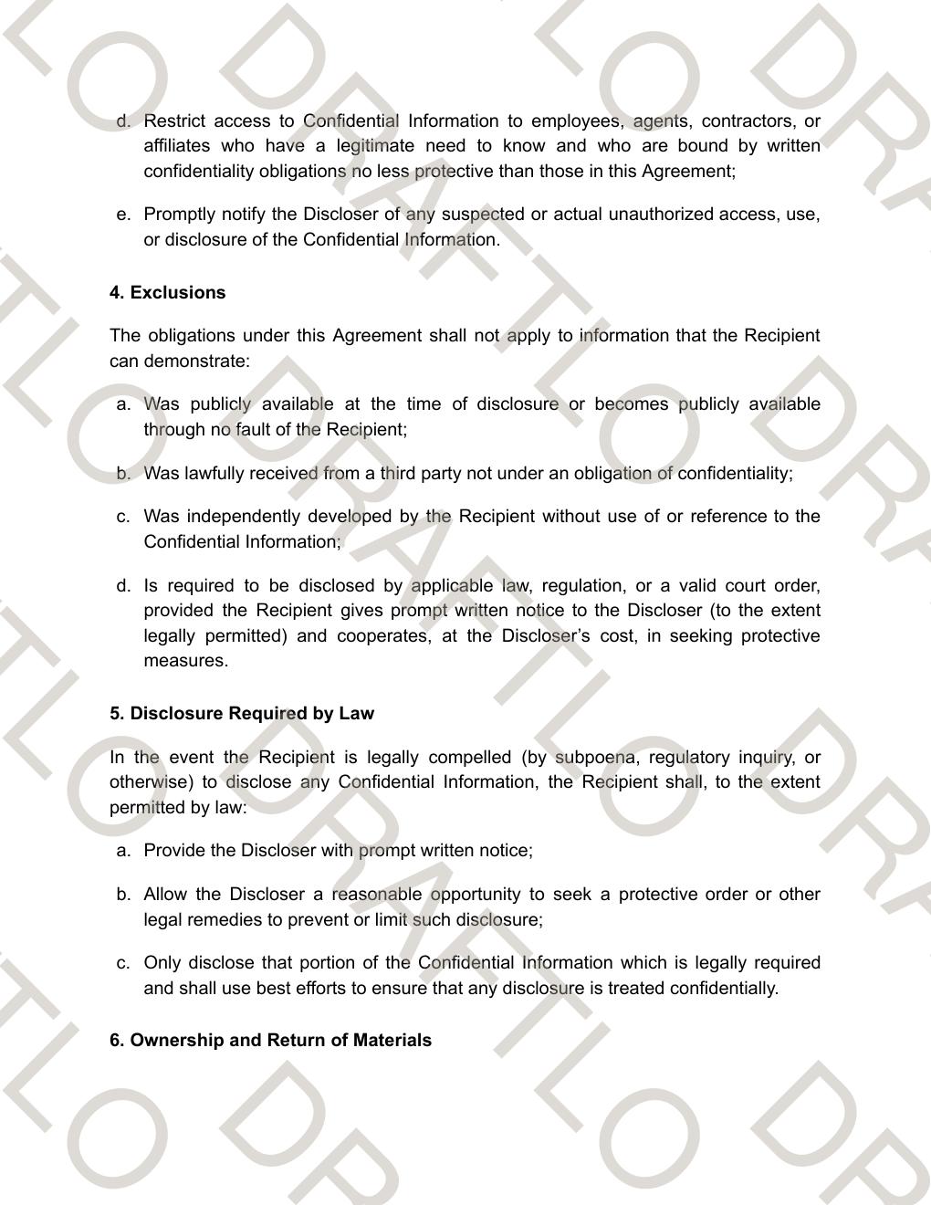 - Standard exclusions for publicly available information, independently developed knowledge, and legally required disclosures
