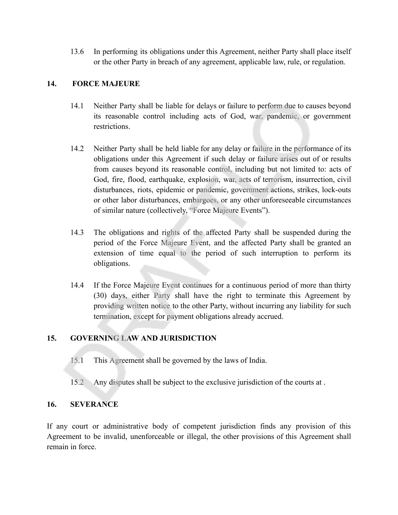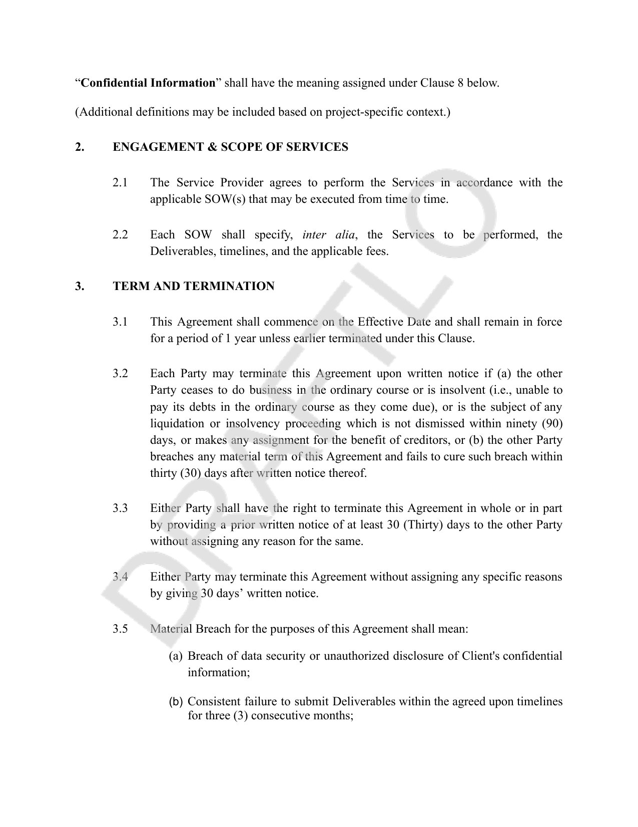 - Strong termination framework covering material breach definitions, 30-day notice periods, and force majeure provisions