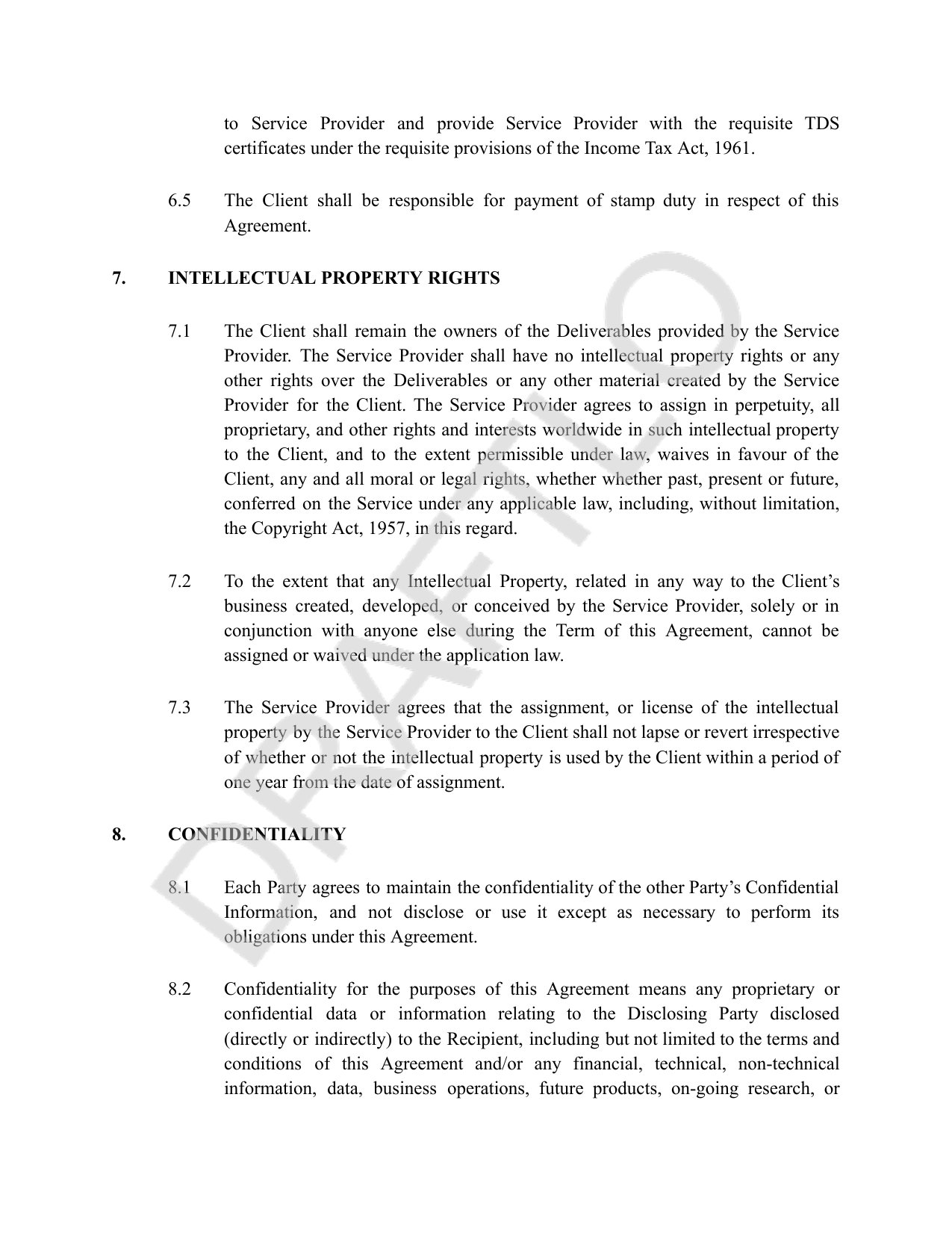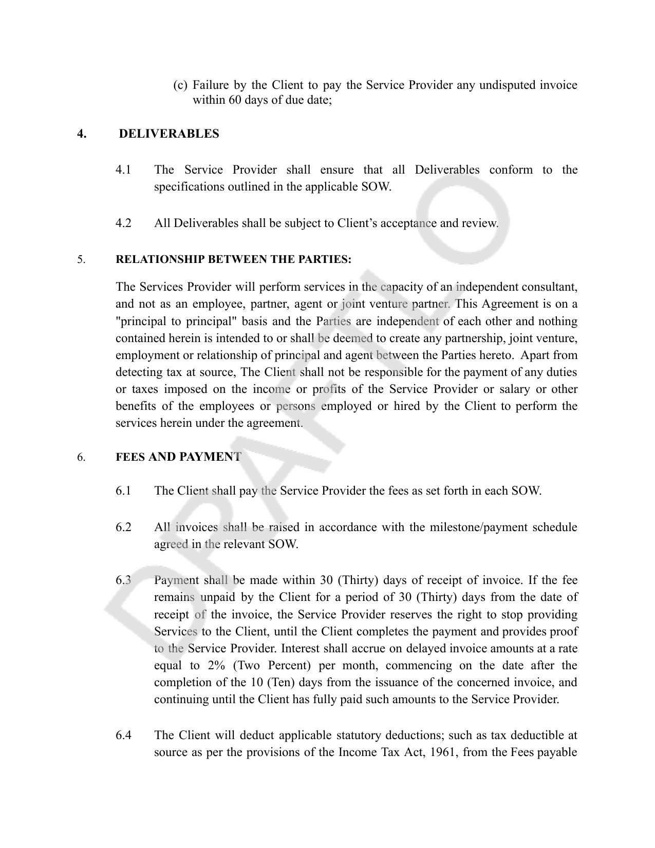 - Detailed payment terms with 30-day cycles, TDS provisions, 2% monthly interest on delays, and expense reimbursement