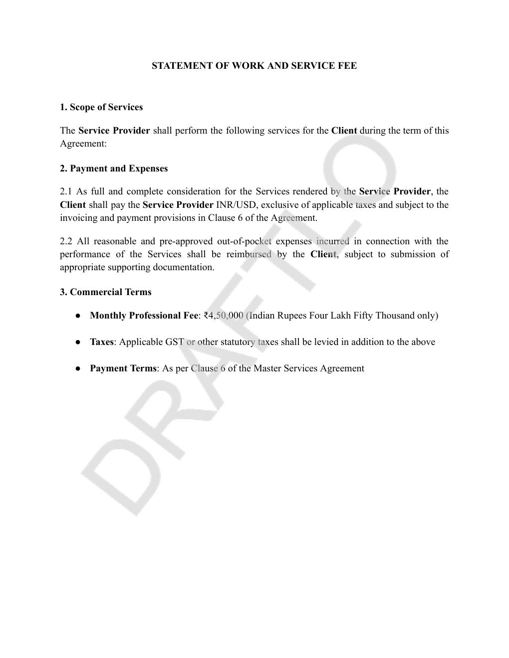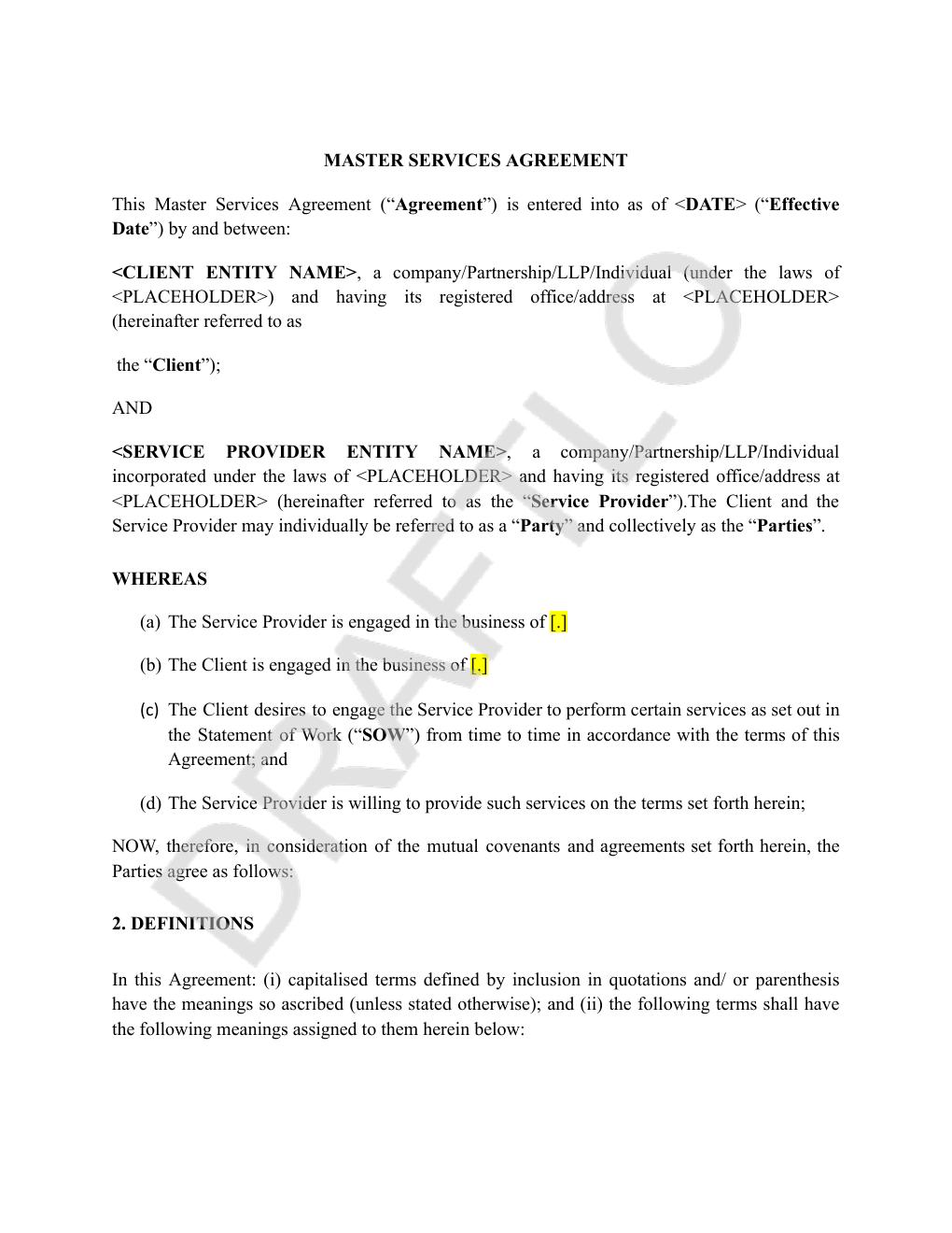 This document is a Master Services Agreement (MSA) template designed for professional service engagements in India.