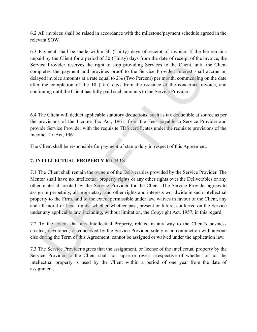 - Flexible payment terms with interest on delays and milestone-based invoicing