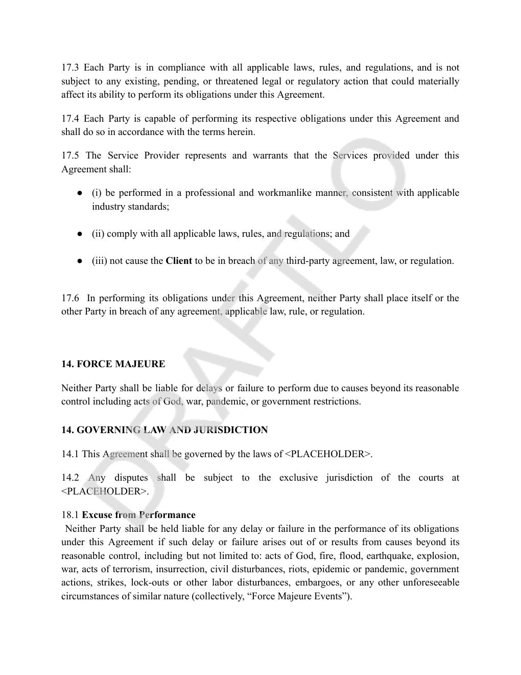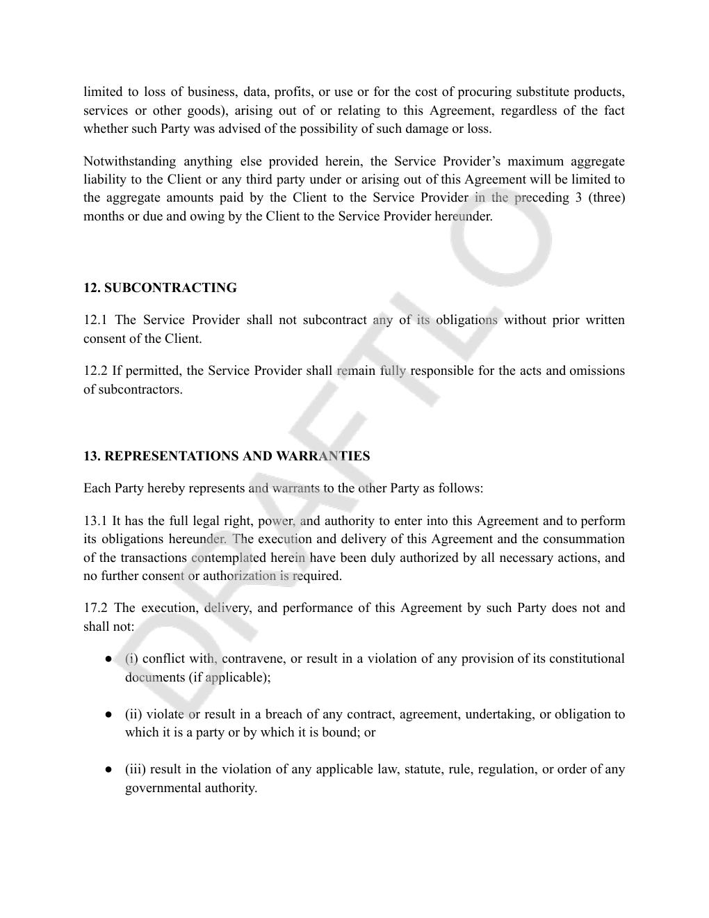 - Professional service focus including subcontracting controls, non-solicitation clauses, and performance warranties
