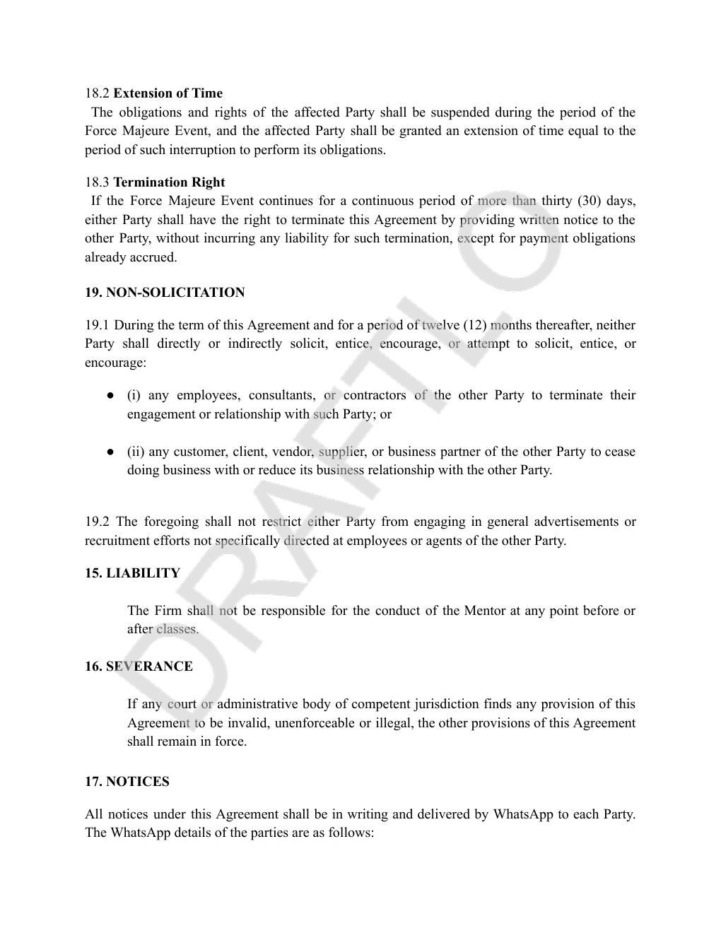 Disclaimer: This agreement does not constitute legal advice or legal services of any kind. This is merely a first draft provided for your ease. Please consult a lawyer before you finalise the draft.