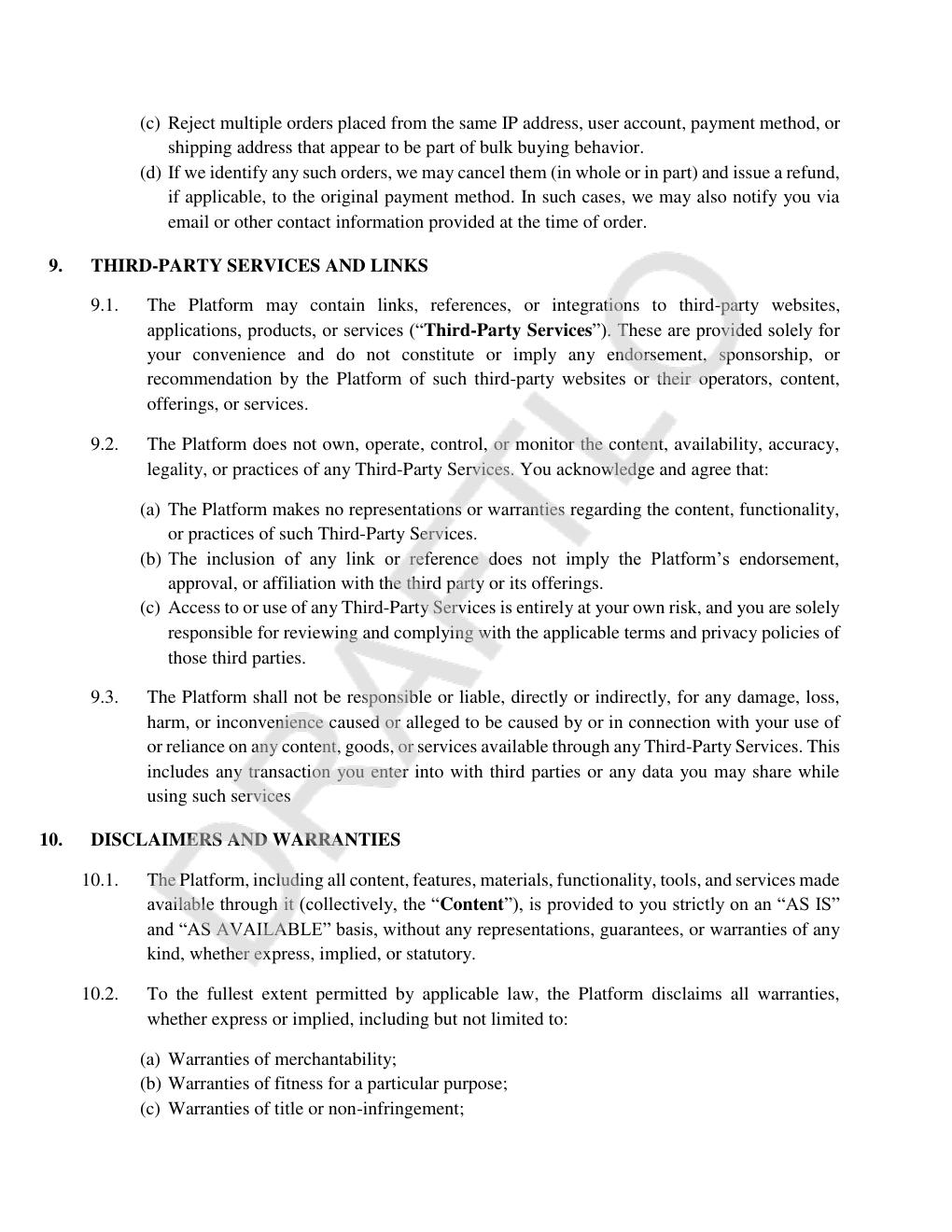 - Product-focused clauses covering listings, pricing, payments, orders, cancellations, and refunds